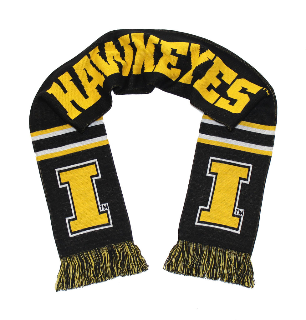 Tradition Scarves’ brand new officially licensed Iowa scarf is knitted from 100% soft Turkish acrylic and features the school logo and nickname in the official school colors. Scarf measures approximately 55 inches by 7 inches wide, plus 3 inch tassels.